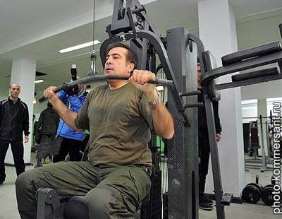 Президент Саакашвили ворвался в расположение батальона с пятилетним сыном Николозом. Оба в камуфляже и без головных уборов. Энергичный главнокомандующий пробежался во главе одной из рот по полигону, юркнул в спортзал, где инструктор демонстрировал бойцам, куда нужно бить противника ножом, чтобы рассечь артерию, посидел на тренажере, съел тарелку супа из общего котла и так же стремительно отбыл.